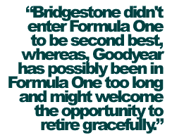 As will be appreciated, there are a number of "ifs" and "buts" in this script, nevertheless, it is a likely situation. Bridgestone didn't enter Formula One to be second best, whereas, Goodyear has possibly been in Formula One too long and might welcome the opportunity to retire gracefully. Should this occur, will it mean that Bridgestone will assume the mantel of sole race tyre supplier to Formula One? The answer is an emphatic "No".