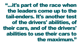 Similarly, it's part of the race when the leaders come up to the tail-enders. It's another test of the drivers' abilities, of their cars, and of the drivers' abilities to use their cars to the maximum.