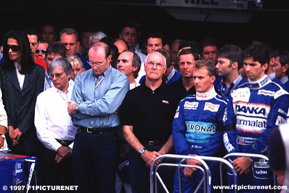 Before qualifying Damon Hill had arranged a one-minute silence to coincide with the end of the funeral service for Diana, Princess of Wales and was joined by most of the British contingent including Bernie Ecclestone.