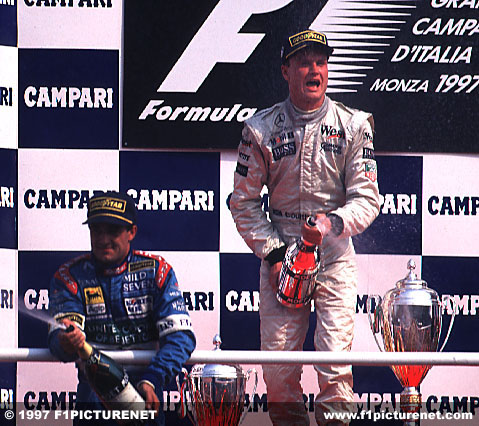 The podium was a sombre affair, David Coulthard stating after the race that he was not sure if it was right to spray champagne and be happy when much of the World was in mourning over the loss of Diana, Princess of Wales. In the end they decided that tradition should take precedence and all three drivers made a half-hearted show in front of the massed throng of Tifosi.