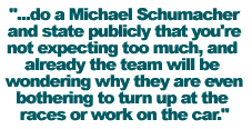 On the other hand, do a Michael Schumacher and state publicly that you're not expecting too much, and already the team will be wondering why they are even bothering to turn up at the races or work on the car.