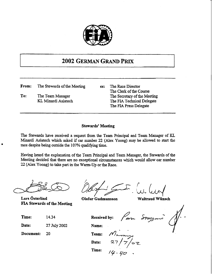 Minardi boss Paul Stoddart sent a request in order for Yoong to be allowed to race, but the race stewards said there were no extraordinary circumstances and so the Malaysian will not race.